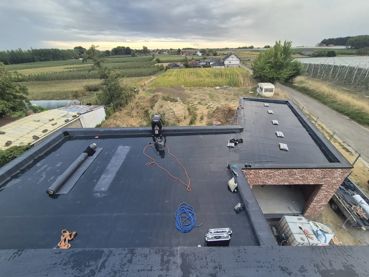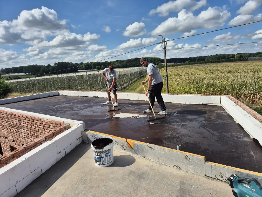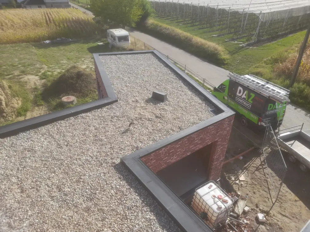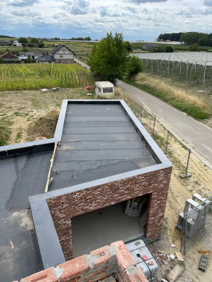 Bij dit moderne nieuwbouwproject bouwde DAZ Construct een volledig plat dak op, van primer tot ballast. Er werd gekozen voor EPDM-dakbedekking: strak, onderhoudsvriendelijk en duurzaam. Het resultaat sluit perfect aan bij de hedendaagse architectuur en normen voor energiezuinig bouwen.