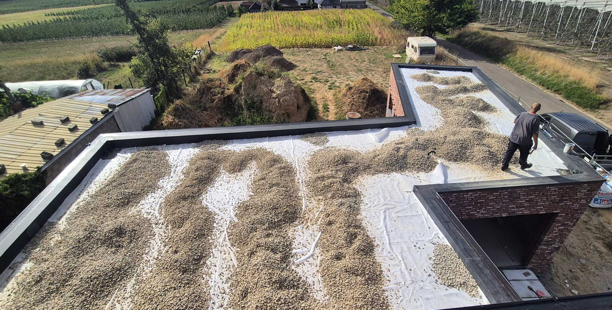 De renovatie begon met het voorbereiden van de draagvloer, gevolgd door het primeren van het dakoppervlak. Daarna werd de EPDM-folie naadloos aangebracht, inclusief afwerking van randen en doorvoeren. Tot slot zorgde een ballastlaag van zorgvuldig verdeelde kiezel voor extra bescherming en een strakke afwerking.
