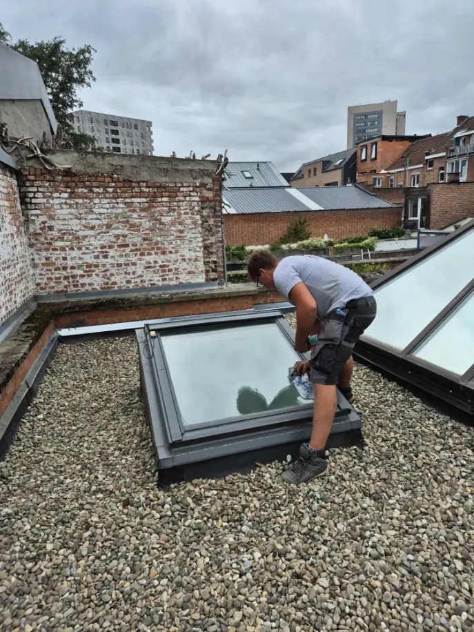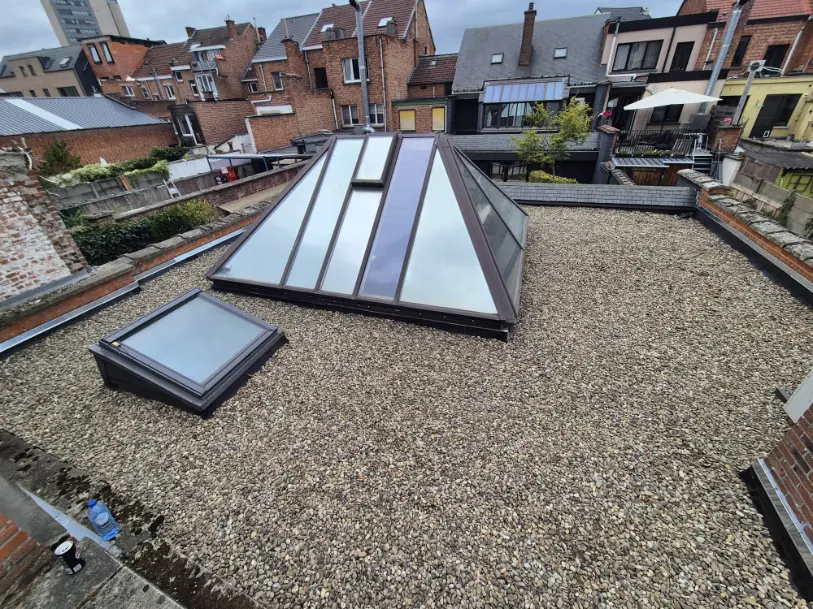 Het dak werd voorbereid, geprimed en voorzien van naadloze EPDM-folie. Rond opstanden en doorvoeren, zoals de opvallende lichtkoepel, werd alles nauwkeurig afgewerkt. Tot slot kwam er een nieuwe kiezelballast bovenop — voor extra bescherming én een strak resultaat.